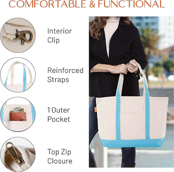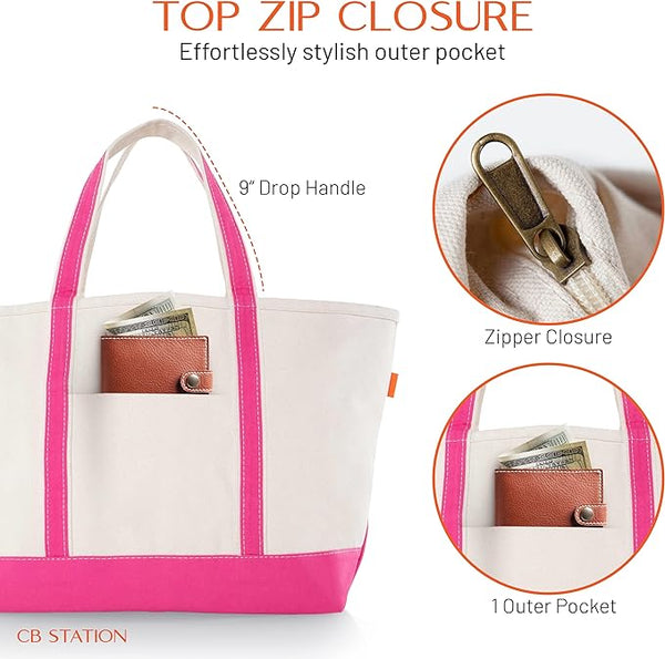 The Large Classic Tote: your ultimate beach companion. Ideal for your needs or family essentials, its spacious interior makes it perfect for any outing. With a timeless design, top zip, and a handy outer pocket for quick access to items like a phone, it's not just a beach bag – it's an all-in-one solution!