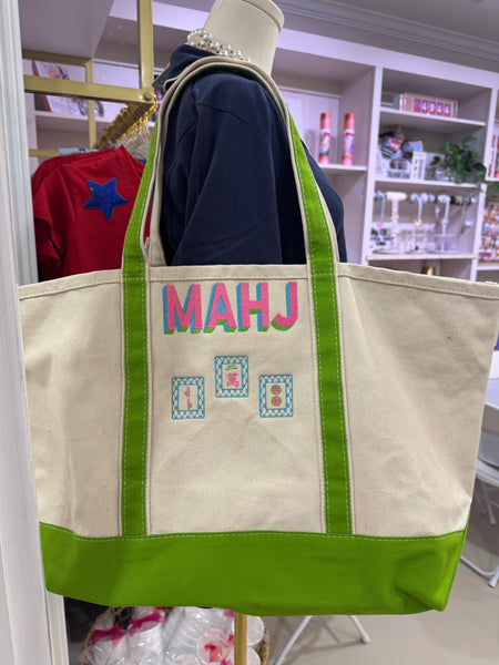 MAHJ embroidered in two coordinating colors at the top, with Crack, Dot, and Bam tiles embroidered underneath to coordinate.