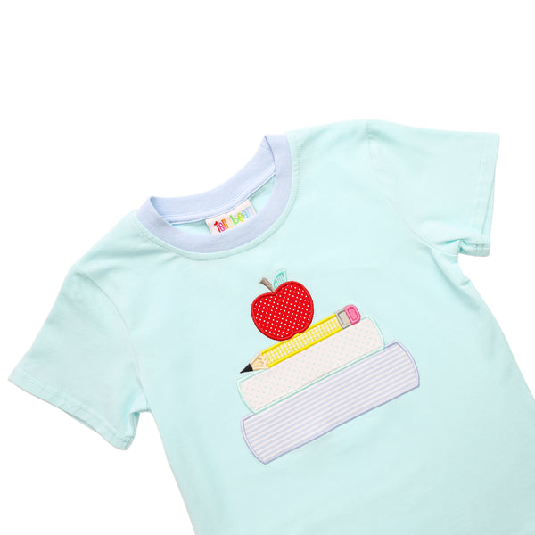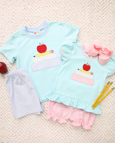Add a touch of whimsy to your little one's wardrobe with our School Book Stack Short Set. The mint shirt features a playful, while the blue and white striped shorts add a pop of color. Complete with stacked books, pencil, and apple, this set is perfect for school or playtime. Matching girl set available. 95% Cotton 5% Spandex. Fits true to size.
