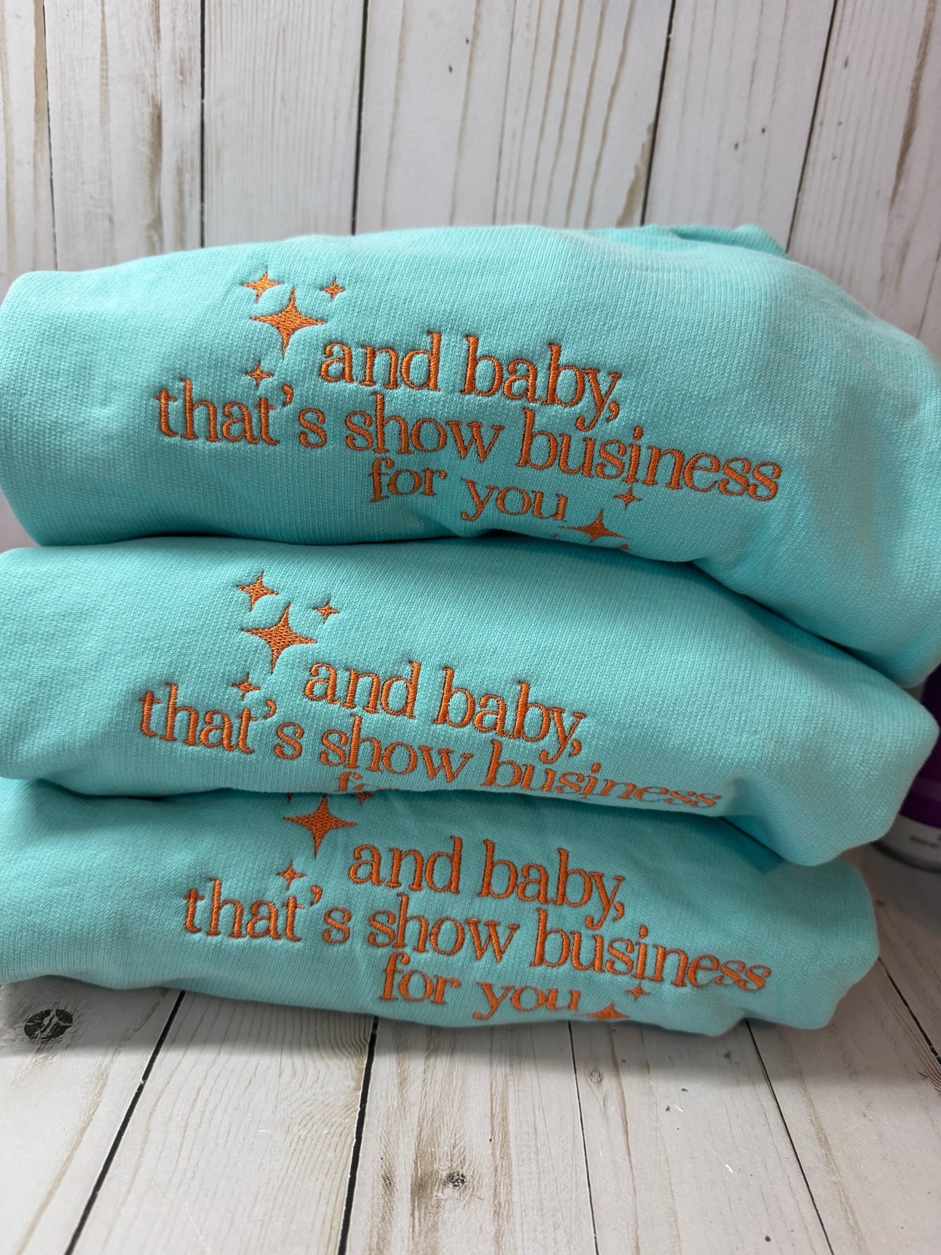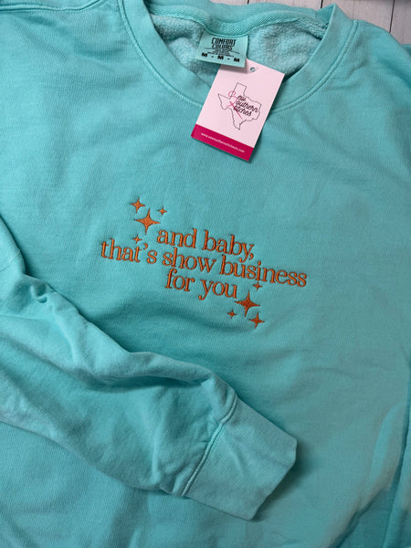 Comfort Colors lightweight sweatshirt in chalky mint. Embroidered in orange with "And baby, that's sow business for you"