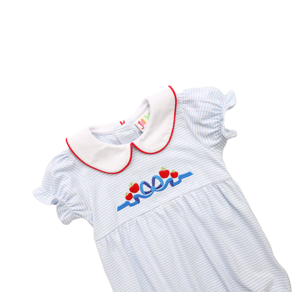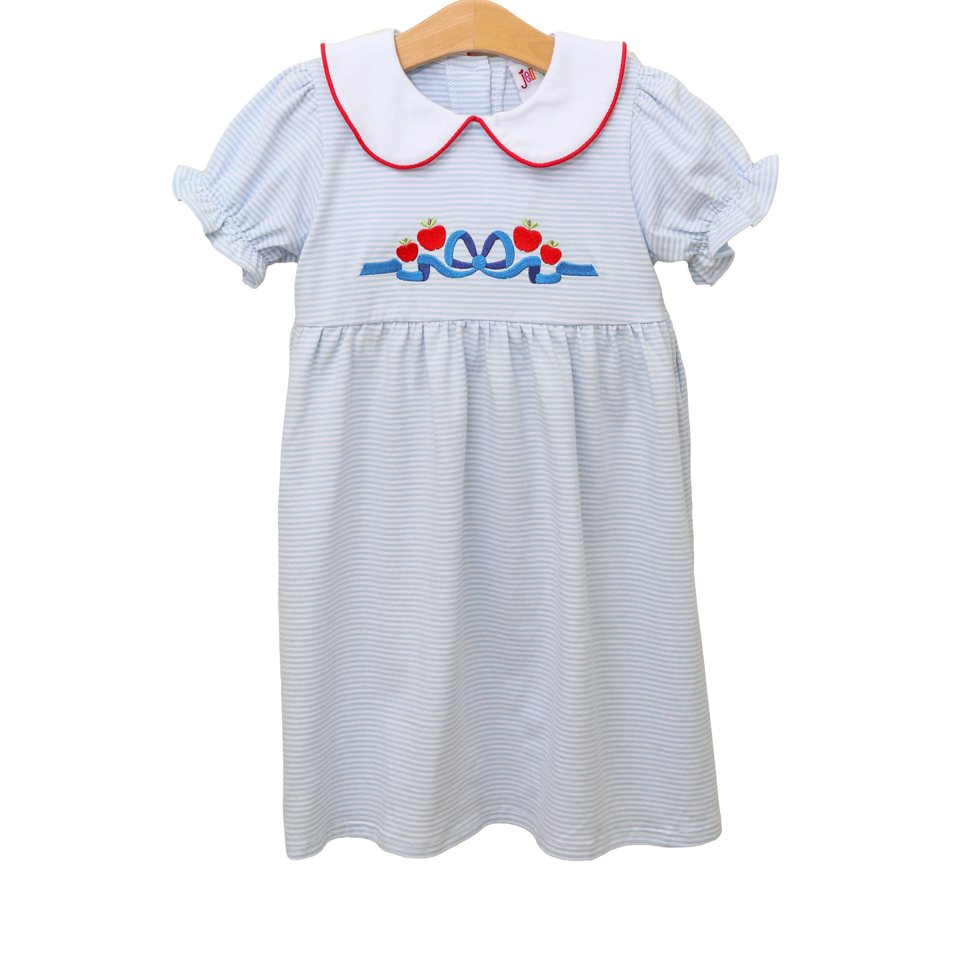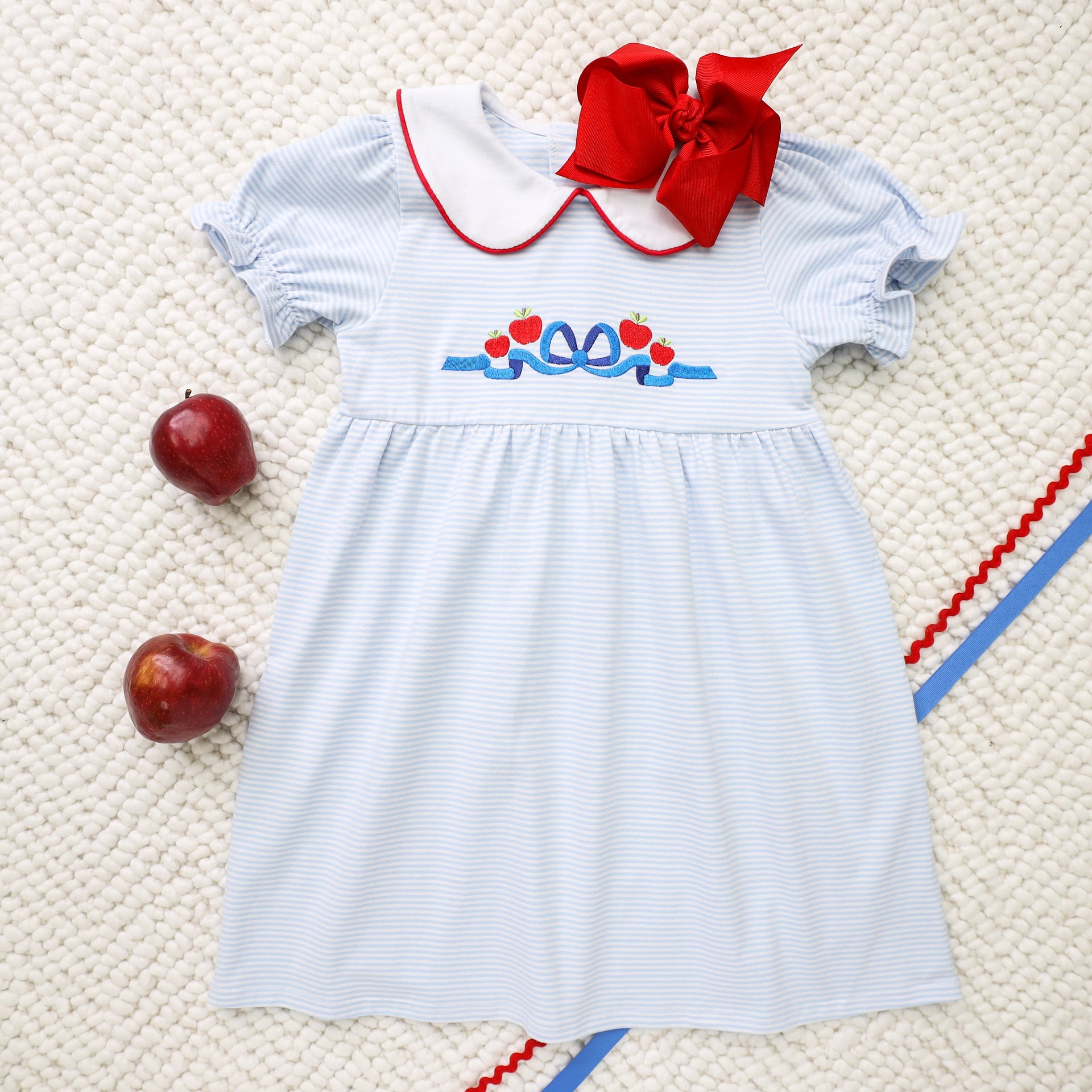 Add some sweetness to your little girl's wardrobe with the Apples and Bows Embroidery Dress! This charming dress features a cute peter pan collar and delicate embroidery of apples and bows. The light blue and white stripes add a touch of whimsy. Perfect for playtime or special occasions. 95% Cotton 5% Spandex. Fits true to size.